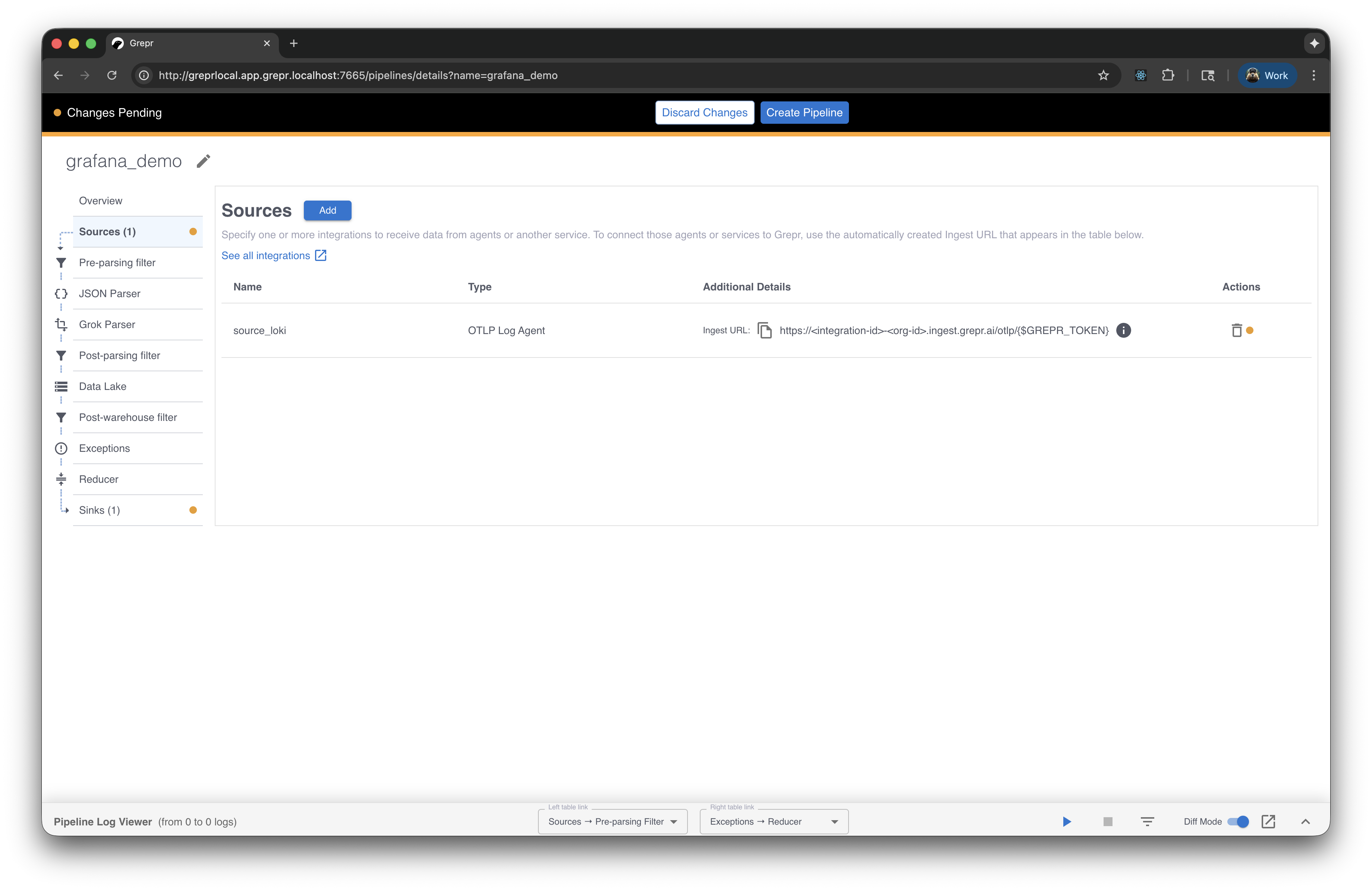 - In the Grepr UI, go to the details page of an existing pipeline or create a new pipeline from the homepage.