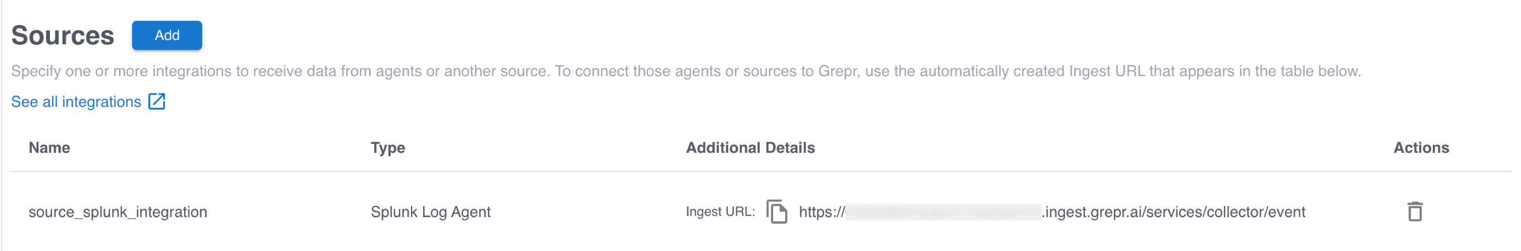 You can use the Grepr UI or REST API to add a Splunk integration. To learn how to create a Splunk integration in the Grepr UI and configure collectors to send logs to Grepr, see Use a Splunk integration in a Grepr pipeline.